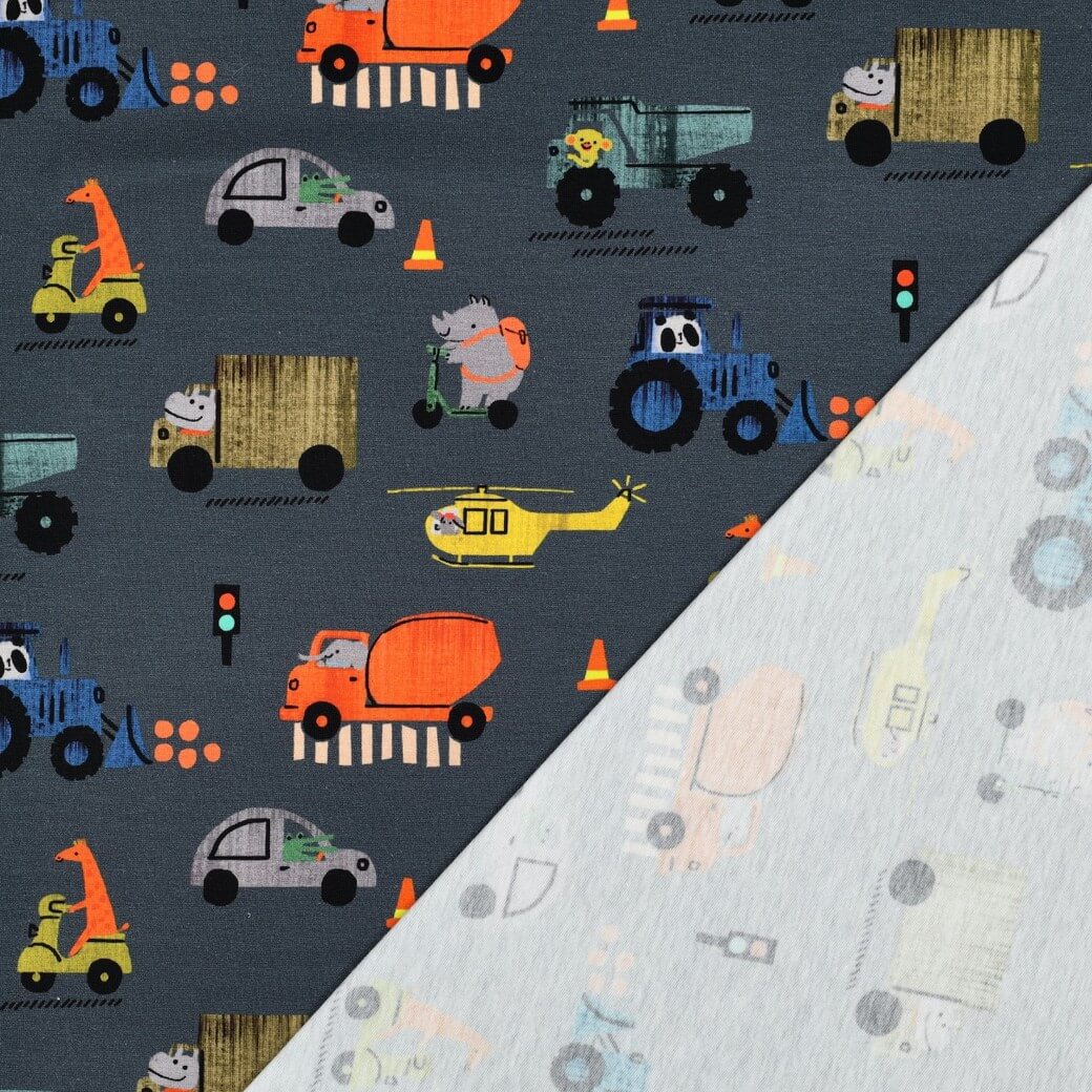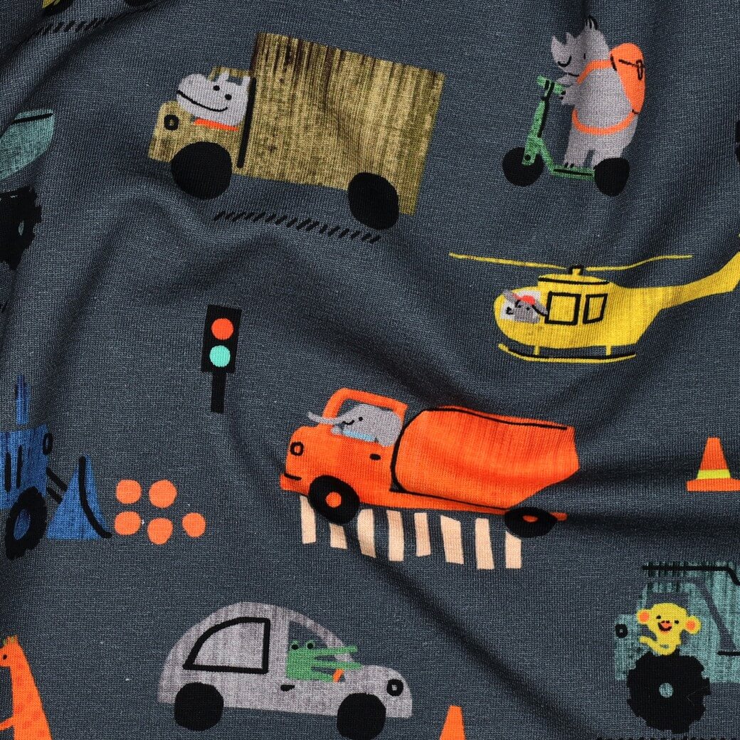 Esta camisola maravilhosamente macia apresenta um estampado digital com um design amoroso que abre imediatamente o apetite para a aventura. Animais alegres e veículos coloridos passeiam sobre um fundo azul-escuro profundo: pequenos carros e autocarros que passam por estradas imaginárias, figuras de animais bonitos que olham curiosamente para o mundo - tudo ricamente detalhado, colorido e harmoniosamente coordenado.