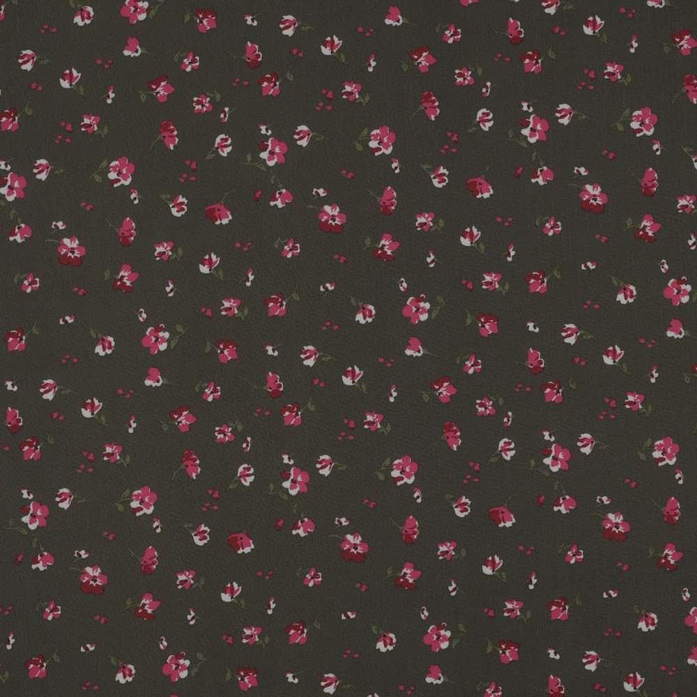 Delicado como uma brisa de primavera: Este chiffon encanta com um padrão floral vibrante em verde fresco e rosa brilhante. As flores finas e detalhadas parecem dançar de forma lúdica sobre o tecido transparente, conferindo a cada projeto de costura um toque feminino e romântico.