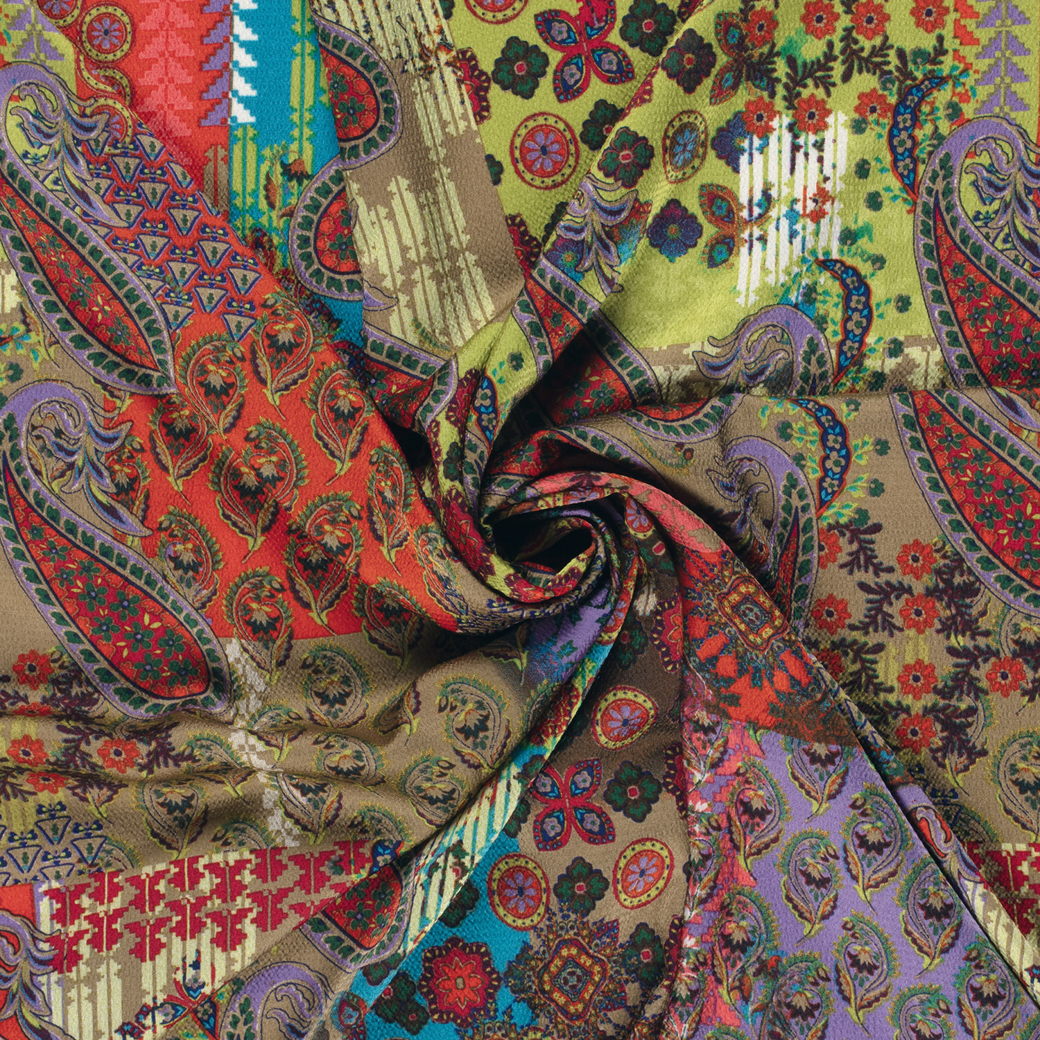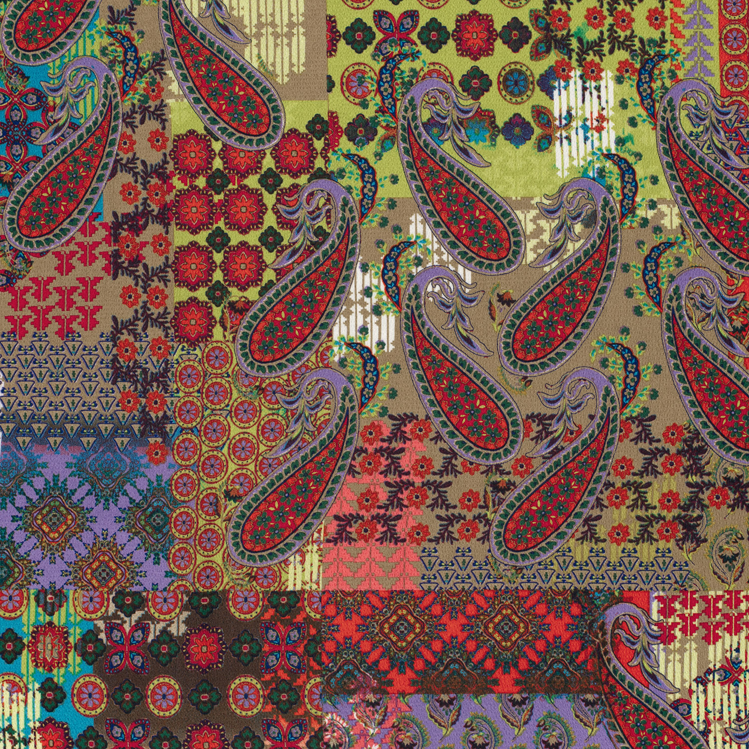 Um toque de luxo para os seus projetos de costura: Este cetim seduz com um design paisley vibrante em vermelho intenso, entrelaçado com elementos divertidos “bubble”. Finos ornamentos multicoloridos – tons delicados de azul, amarelo, verde e rosa – dançam sobre o tecido criando um padrão excitante, quase oriental.