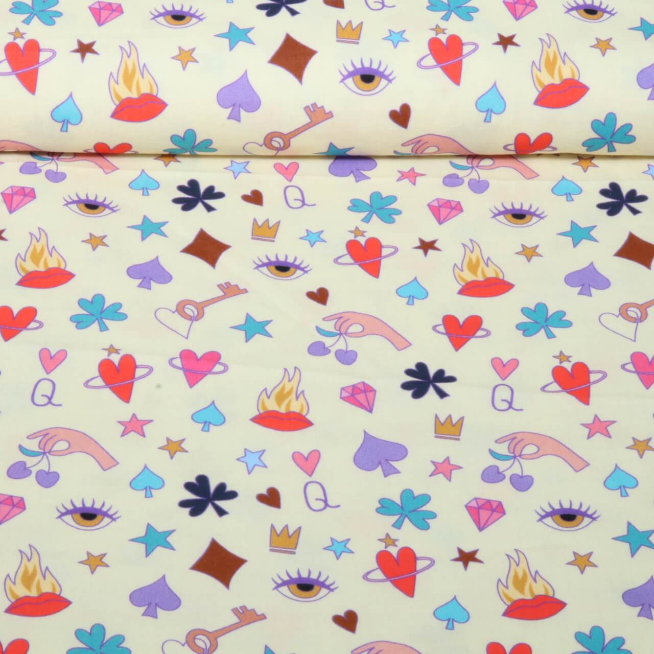 Musselina orgânica delicada num tom bege quente, decorada com um padrão fino de pequenos corações e coroas estilizadas. Os motivos subtis têm um aspeto lúdico mas sofisticado e criam um visual encantador e moderno.