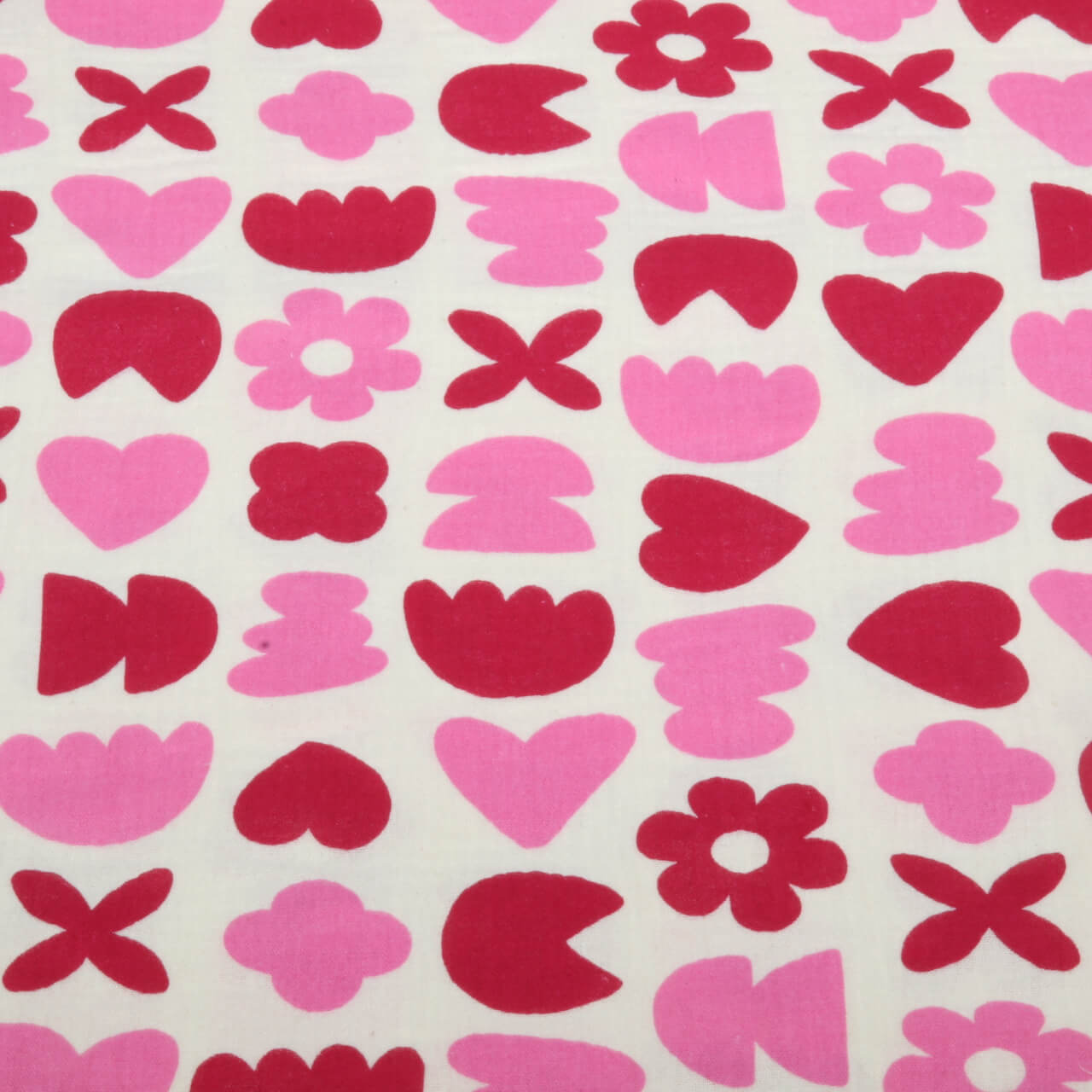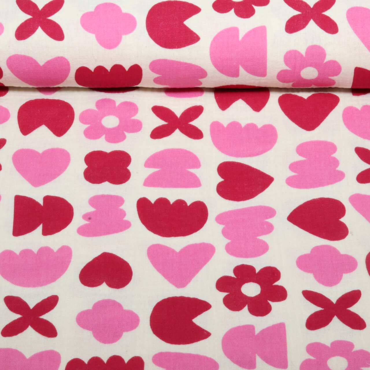 Esta encantadora musselina seduz com uma mistura alegre de corações, flores estilizadas e formas divertidas em vermelho intenso e rosa vibrante sobre um fundo em tom natural. O design gráfico, ligeiramente inspirado no estilo retro, parece ao mesmo tempo moderno e cheio de carinho – perfeito para todos os que adoram padrões frescos e alegres.