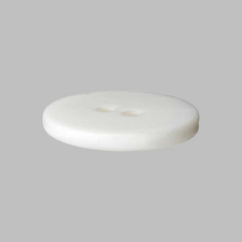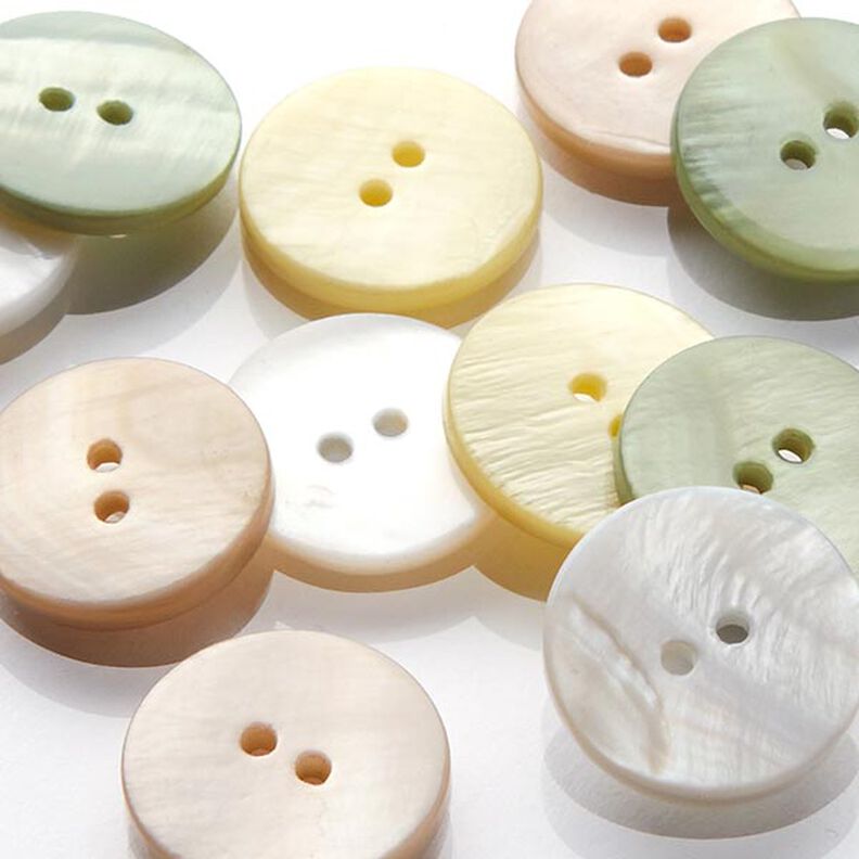 Botão de dois furos brilhante de excelente qualidade, em madrepérola genuína. Os botões de madrepérola são utilizados na confeção de vestuário exterior feminino, como por exemplo, botões para blusas, malhas leves ou sobretudos e casacos de alta qualidade.