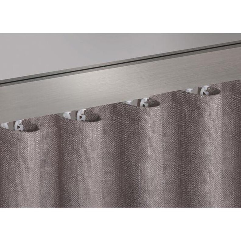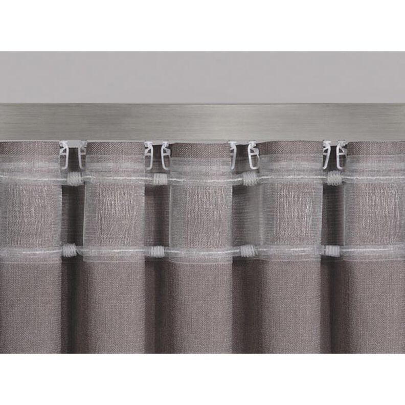 Para tecidos com ou sem repetição Para tecidos leves ou transparentes, ou tecidos para decoração de peso médio Apropriada tanto para calhas como para varões Indicada para usar com ganchos ou deslizadores Acréscimo: 200% | 1:2 Repetição: 240 mm aprox. Largura das presilhas: 60 mm aprox. Comprimento das presilhas: 40 mm aprox. Largura das aselhas: 10 mm aprox. Comprimento das aselhas: 10 mm | 200 mm aprox. Distância das pregas: 120 mm aprox. Número de pregas: 1 Largura total: 100 mm