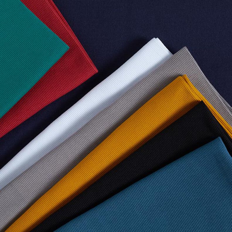 Ótimo para remates de bainhas e punhos. Mas também poderá costurar rapidamente um gorro ou cachecol cheios de estilo! - O SEU PROJETO DE COSTURA: para este tecido para bordas bastante elástico, convém usar uma agulha de Jersey. A borda deve ser sempre cortada com menos alguns centímetros do que o tamanho da costura de união, pois expande ligeiramente ao costurar.