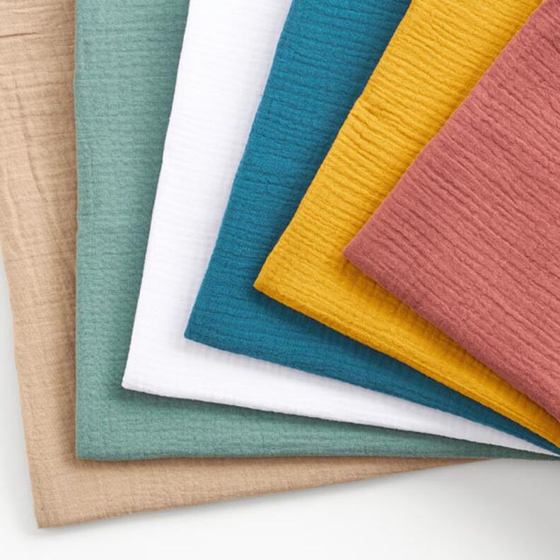 - MUSSELINA: Anteriormente conhecido como pano para fraldas ou babetes, este tecido de plissado duplo bastante macio, também conhecido como musselina/mousseline ou «double gauze», é muito apreciado por miúdos e graúdos. Com musselina, não se fazem só toalhas, mas também vestidos muito bonitos, túnicas, roupa de criança e muito mais!