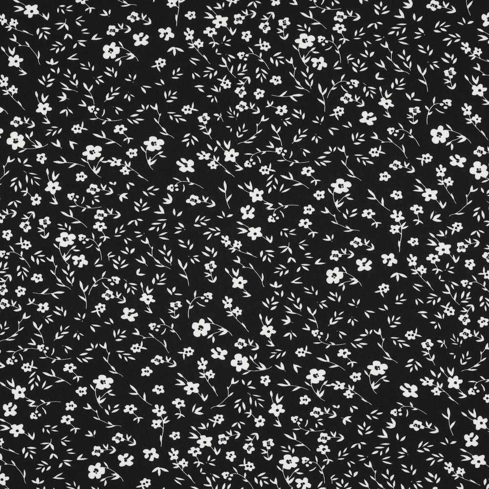 Um clássico intemporal com um toque moderno: este elegante tecido para blusas e vestidos apresenta um delicado padrão de flores pequenas em contraste claro preto e branco. Pequenas flores delicadas estão distribuídas uniformemente sobre o fundo escuro, criando uma aparência feminina e muito estilosa ao mesmo tempo – perfeito para quem gosta de padrões discretos, mas não aborrecidos.