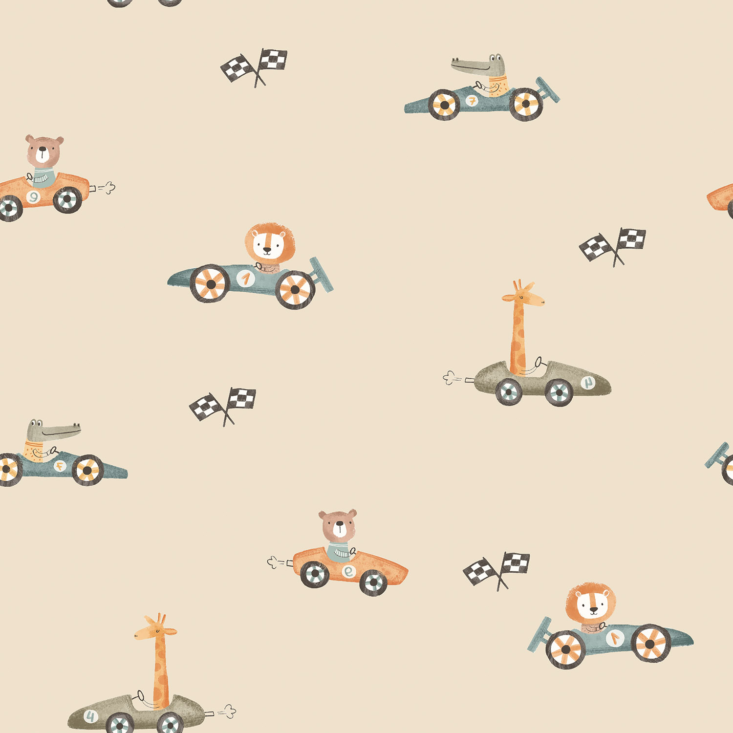 Este tecido para casacos de chuva traz o ambiente das pistas de corrida para qualquer aventura ao ar livre. Sobre um fundo bege, carros de corrida coloridos percorrem a pista – detalhadamente desenhados com contornos nítidos, cores vibrantes e muitos pequenos detalhes que encantam os olhos das crianças.