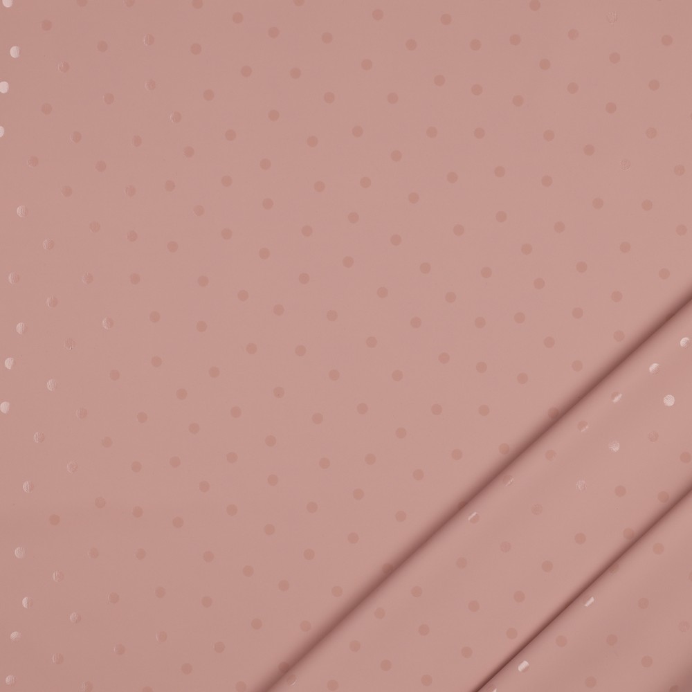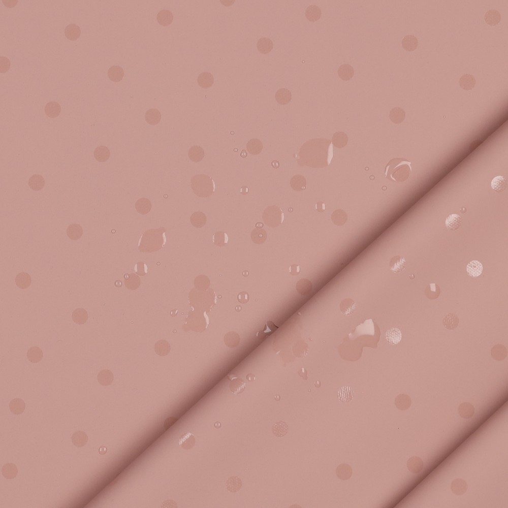 Este encantador tecido para casacos de chuva traz boa disposição aos dias cinzentos. Num fundo rosa suave, dançam pequenos pontos brancos distribuídos uniformemente – um padrão clássico de bolinhas, intemporal e ao mesmo tempo brincalhão.