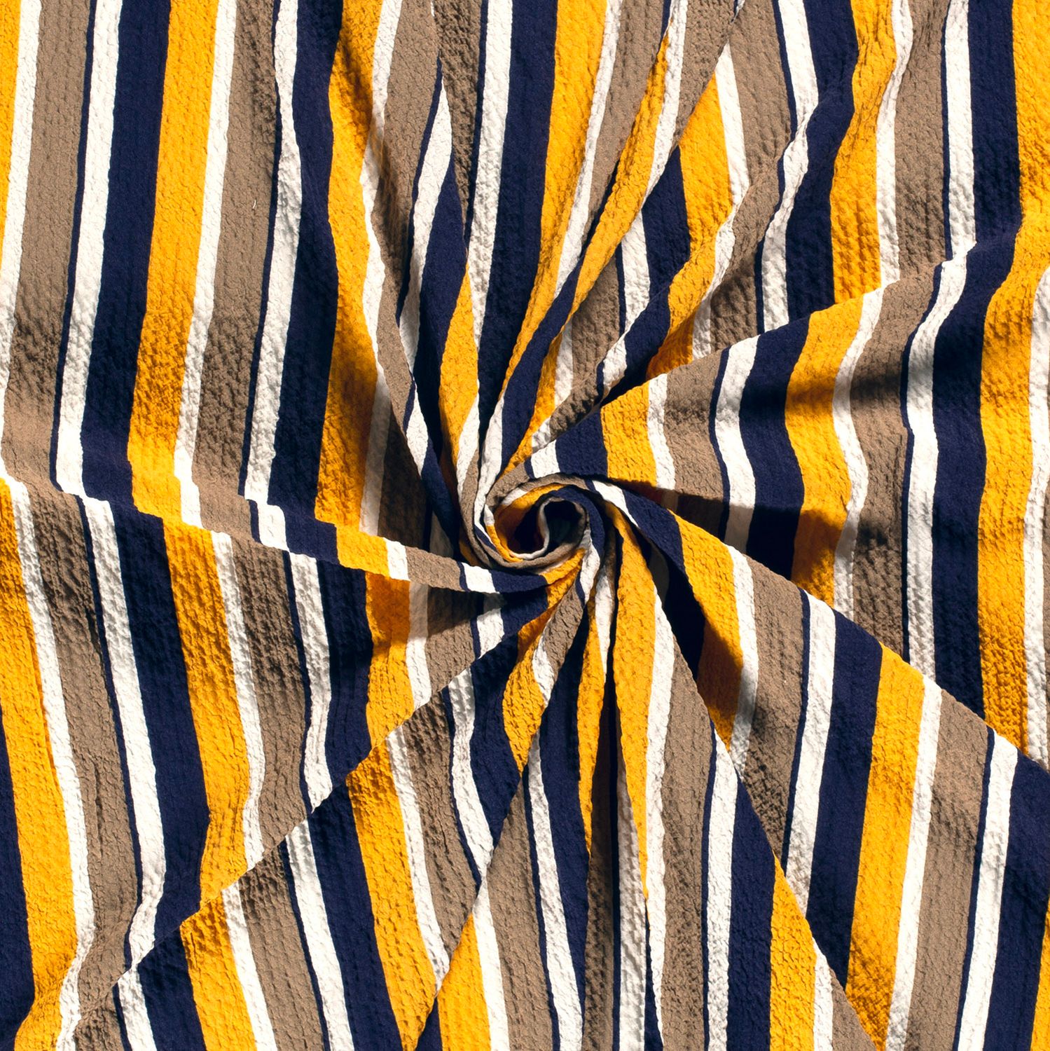Este tecido stretch excecional chama todas as atenções: o design listrado vibrante em amarelo fresco é atravessado por um efeito Bubble Crash empolgante, que confere ao tecido uma estrutura moderna e ligeiramente amarrotada. As finas riscas irregulares parecem dinâmicas e dão ao material um aspeto moderno, quase gráfico.